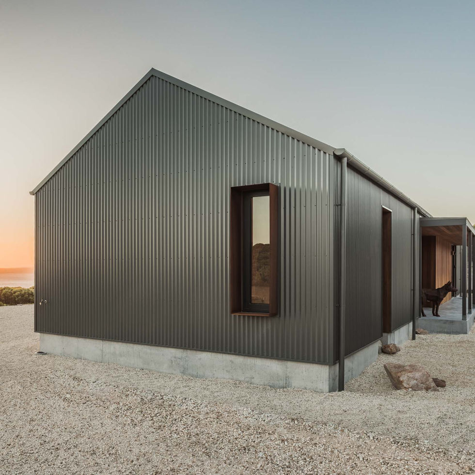 The Native Dog Cabin is a striking retreat situated on a spur of land between Bremer Bay and Dillon Bay, offering breathtaking views of the Southern Ocean. Set amidst a rugged landscape characterized by its wild, muscular quality, the cabin blends seamlessly with its surroundings while maximizing its connection to the natural beauty around it. Inspired by early farms and settlements, the design features a collection of small, simple buildings, with a gable-roofed accommodation unit and a flat-roofed pavilion for the carport and storage. The use of corrugated steel for both walls and roofs, in Colorbond Woodland Grey, allows the structure to visually recede within the bushland setting.
